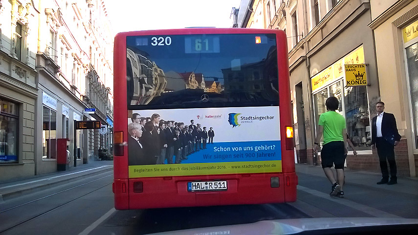 Wer möchte und kann, darf uns gerne weitere Fotos von Bus und Straßenbahn oder auch nur eine Info zuschicken (z. B. per Kommentar s. u.), wann, wo und auf welcher Linie er unsere Chor-Werbung gesehen hat. Vielleicht findet sich ja für den Fleißigsten unter allen noch ein Finderlohn? 😉