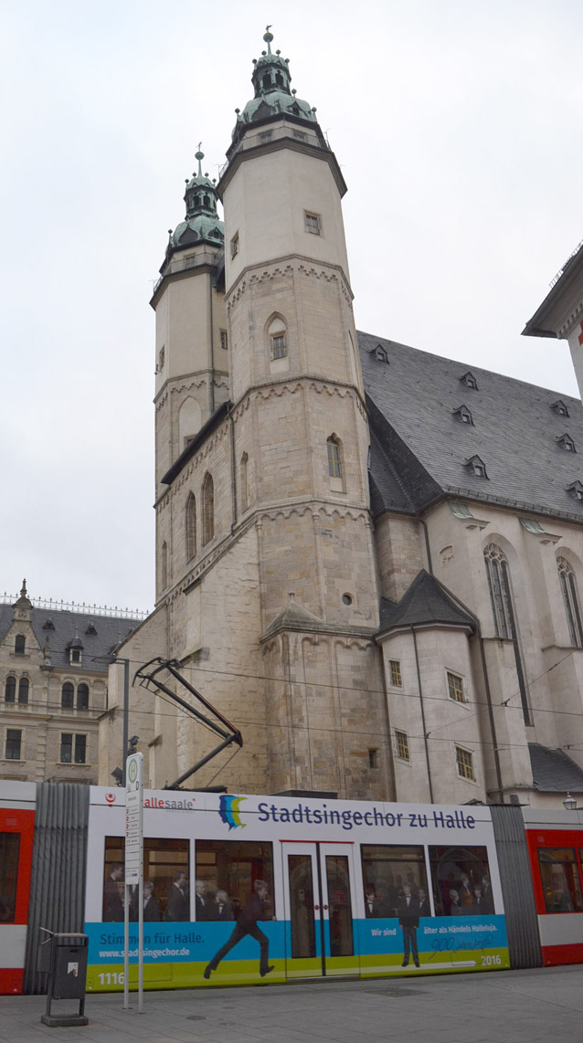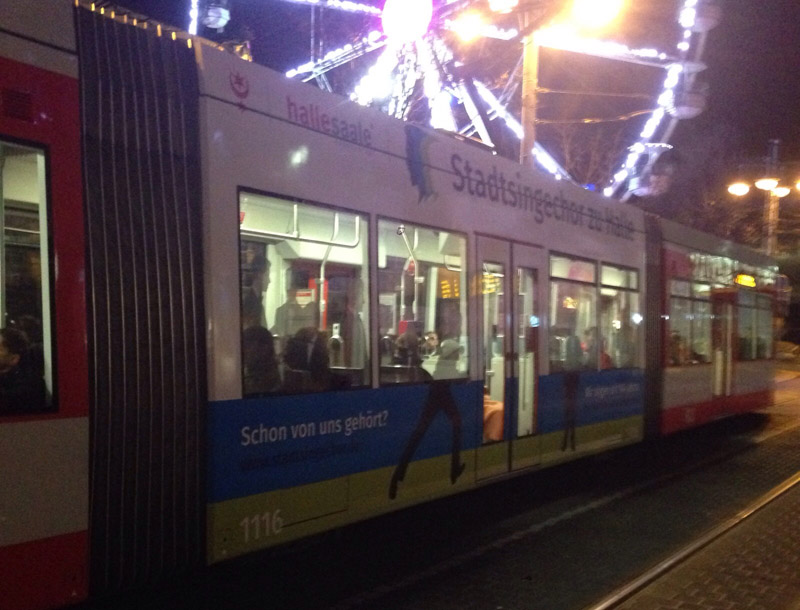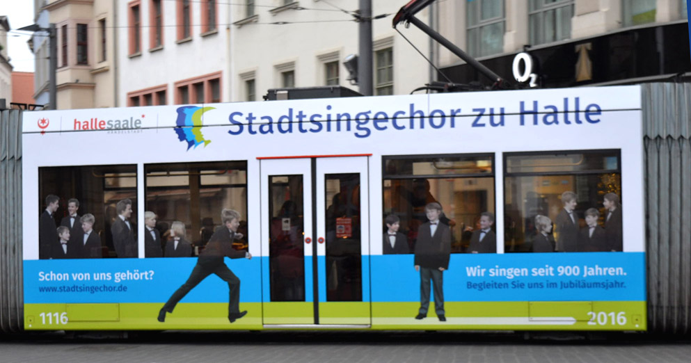 Sicher ist sie einigen schon aufgefallen. Vorfristig fährt bereits seit Anfang Dezember eine Straßenbahn (sowie ein Bus) mit dem neuen Logo des Stadtsingechores zu Halle durch die Stadt, um auf unser 900-jähriges Jubiläum aufmerksam zu machen.