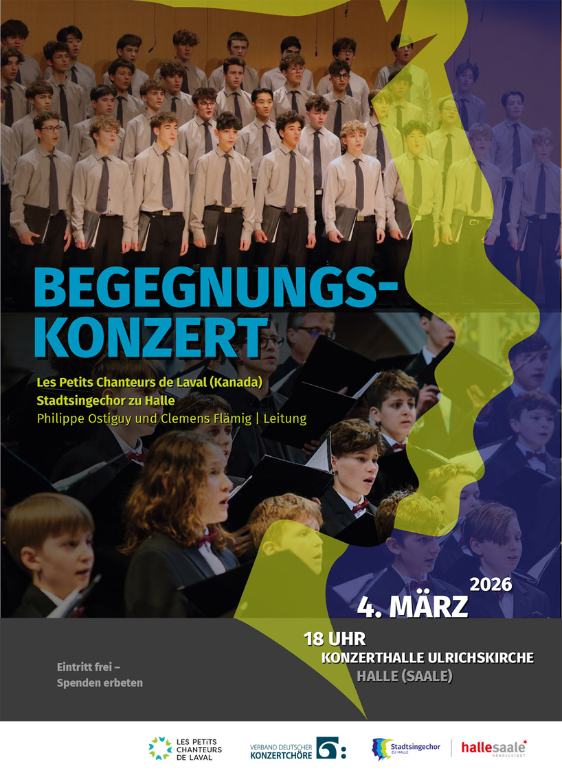 Begegnungskonzert des Stadtsingechores zu Halle mit dem kanadischen Knabenchor „Les Petits Chanteurs de Laval“ am 4. März, 18 Uhr, Konzerthalle Ulrichskirche